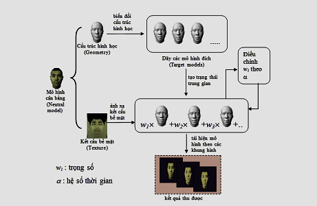 Pha xây dựng hoạt cảnh (hình 2):Trước tiên, mô hình cân bằng sẽ được nạp vào. Sau đó, mô hình này được biến đổi để tạo ra một tập các mô hình theo các âm tiết của lời thoại dựa vào các tập vector biến đổi để có được một dãy chỉ số mô hình xuất hiện trong hoạt ảnh. Cuối cùng, sử dụng kỹ thuật morphing để tạo ra sự chuyển biến trạng thái mềm mại giữa các mô hình để cho ra một hoạt cảnh.
